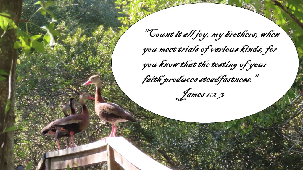 “Count it all joy, my brothers, when you meet trials of various kinds, for you know that the testing of your faith produces steadfastness.” James 1:2-3