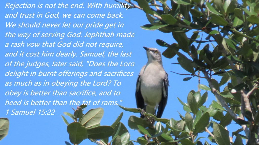 Rejection is not the end. With humility and trust in God, we can come back. We should never let our pride get in the way of serving God. Jephthah made a rash vow that God did not require, and it cost him dearly. Samuel, the last of the judges, later said, “Does the Lord delight in burnt offerings and sacrifices as much as in obeying the Lord? To obey is better than sacrifice, and to heed is better than the fat of rams.”