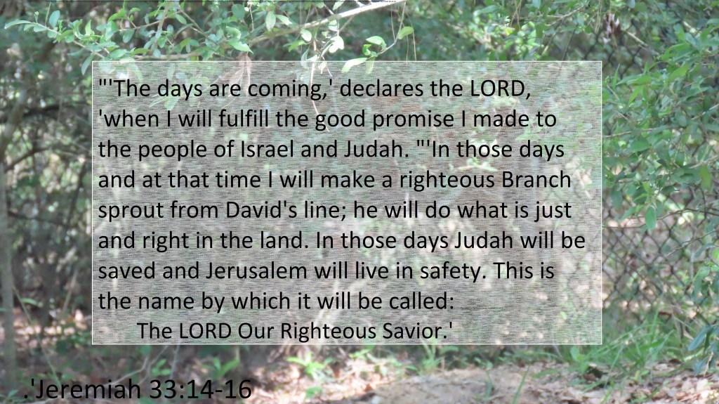 “‘The days are coming,’ declares the LORD, ‘when I will fulfill the good promise I made to the people of Israel and Judah. “‘In those days and at that time I will make a righteous Branch sprout from David’s line; he will do what is just and right in the land. In those days Judah will be saved and Jerusalem will live in safety. This is the name by which it will be called: The LORD Our Righteous Savior.”