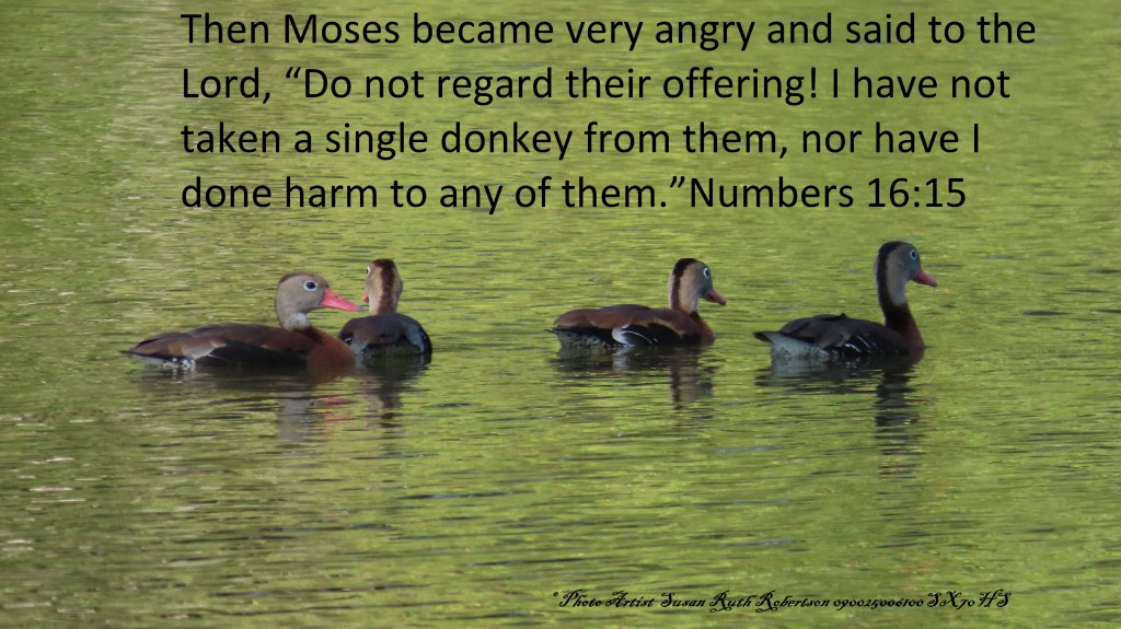 Then Moses became very angry and said to the Lord, “Do not regard their offering! I have not taken a single donkey from them, nor have I done harm to any of them.”