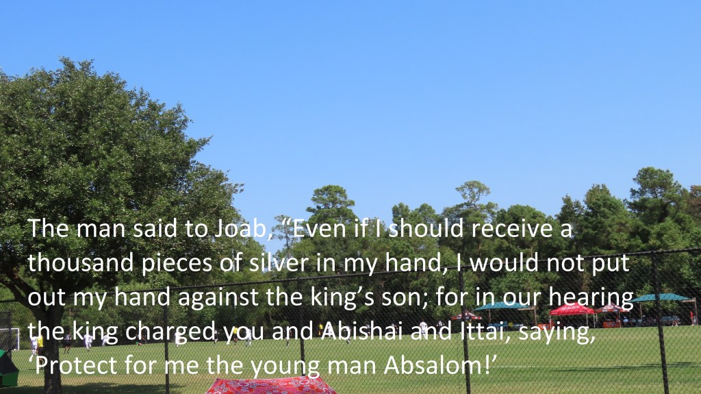 The man said to Joab, “Even if I should receive a thousand pieces of silver in my hand, I would not put out my hand against the king’s son; for in our hearing the king charged you and Abishai and Ittai, saying, ‘Protect for me the young man Absalom!’
