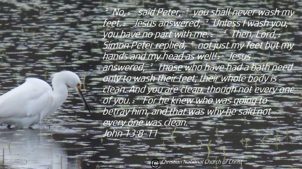 “No,” said Peter, “you shall never wash my feet.” Jesus answered, “Unless I wash you, you have no part with me.” “Then, Lord,” Simon Peter replied, “not just my feet but my hands and my head as well!” Jesus answered, “Those who have had a bath need only to wash their feet; their whole body is clean. And you are clean, though not every one of you.” For he knew who was going to betray him, and that was why he said not every one was clean.