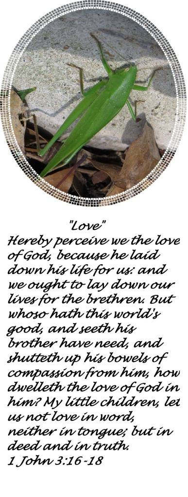 Hereby perceive we the love of God, because he laid down his life for us: and we ought to lay down our lives for the brethren. But whoso hath this world’s good, and seeth his brother have need, and shutteth up his bowels of compassion from him, how dwelleth the love of God in him? My little children, let us not love in word, neither in tongue; but in deed and in truth.