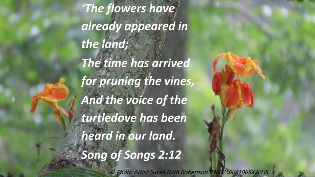 The flowers have already appeared in the land; The time has arrived for pruning the vines, And the voice of the turtledove has been heard in our land. Song of Songs 2:12