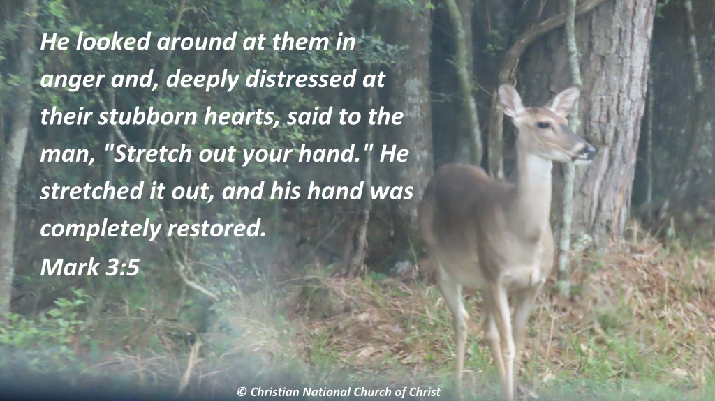 He looked around at them in anger and, deeply distressed at their stubborn hearts, said to the man, “Stretch out your hand.” He stretched it out, and his hand was completely restored.