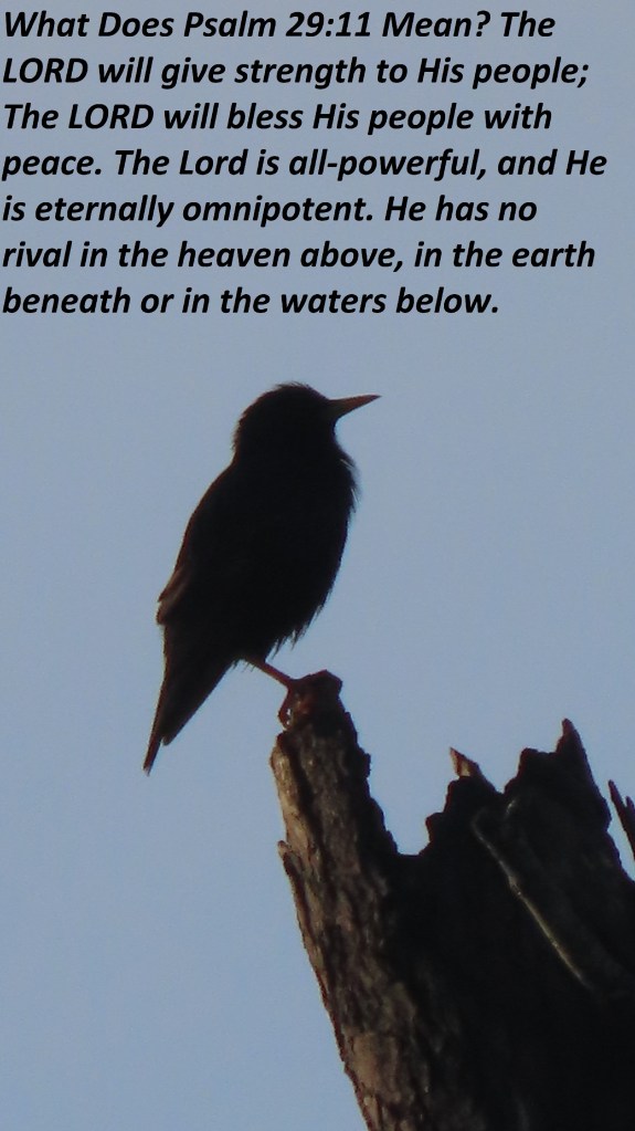 What Does Psalm 29:11 Mean? The LORD will give strength to His people; The LORD will bless His people with peace. The Lord is all-powerful, and He is eternally omnipotent. He has no rival in the heaven above, in the earth beneath or in the waters below.