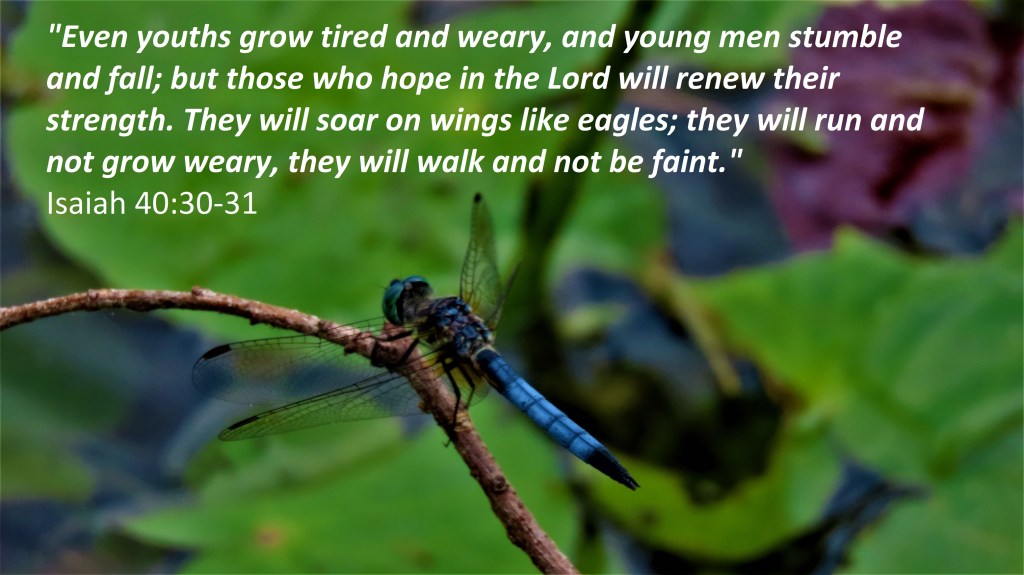 “Even youths grow tired and weary, and young men stumble and fall; but those who hope in the Lord will renew their strength. They will soar on wings like eagles; they will run and not grow weary, they will walk and not be faint.” Isaiah 40:30-31