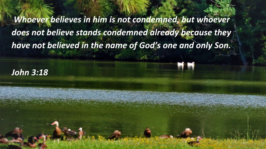 Whoever believes in him is not condemned, but whoever does not believe stands condemned already because they have not believed in the name of God’s one and only Son. John 3:18