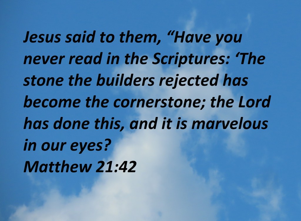 Jesus said to them, “Have you never read in the Scriptures: ‘The stone the builders rejected has become the cornerstone; the Lord has done this, and it is marvelous in our eyes? Matthew 21:42