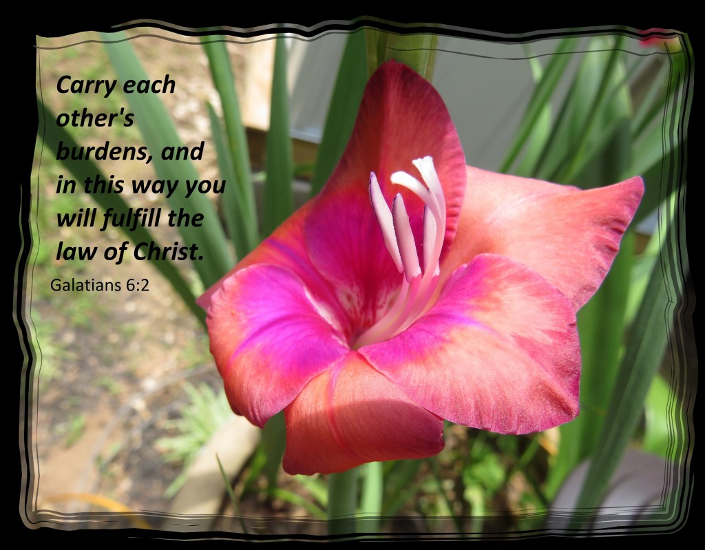 Carry each other’s burdens, and in this way, you will fulfill the law of Christ. Galatians 6:2