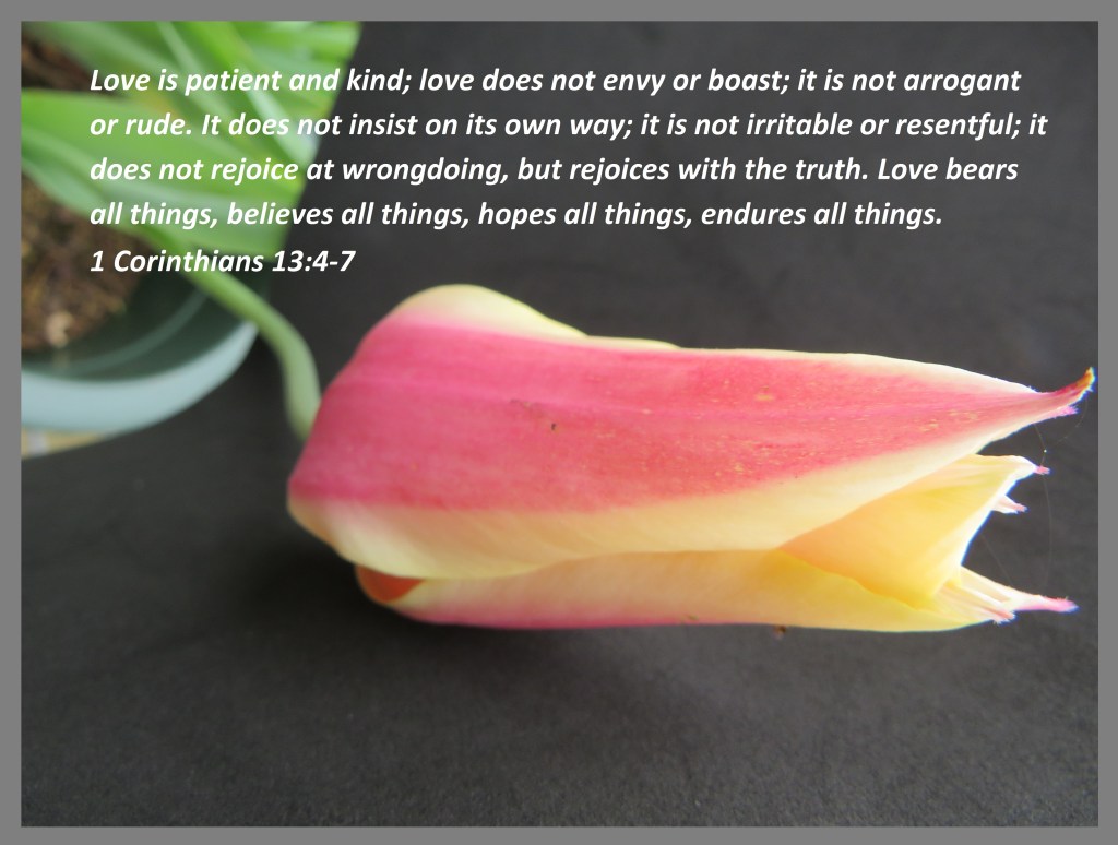 Love is patient and kind; love does not envy or boast; it is not arrogant or rude. It does not insist on its own way; it is not irritable or resentful; it does not rejoice at wrongdoing but rejoices with the truth. Love bears all things, believes all things, hopes all things, endures all things.