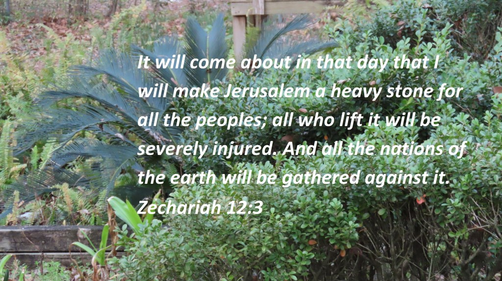 It will come about in that day that I will make Jerusalem a heavy stone for all the peoples; all who lift it will be severely injured. And all the nations of the earth will be gathered against it.
