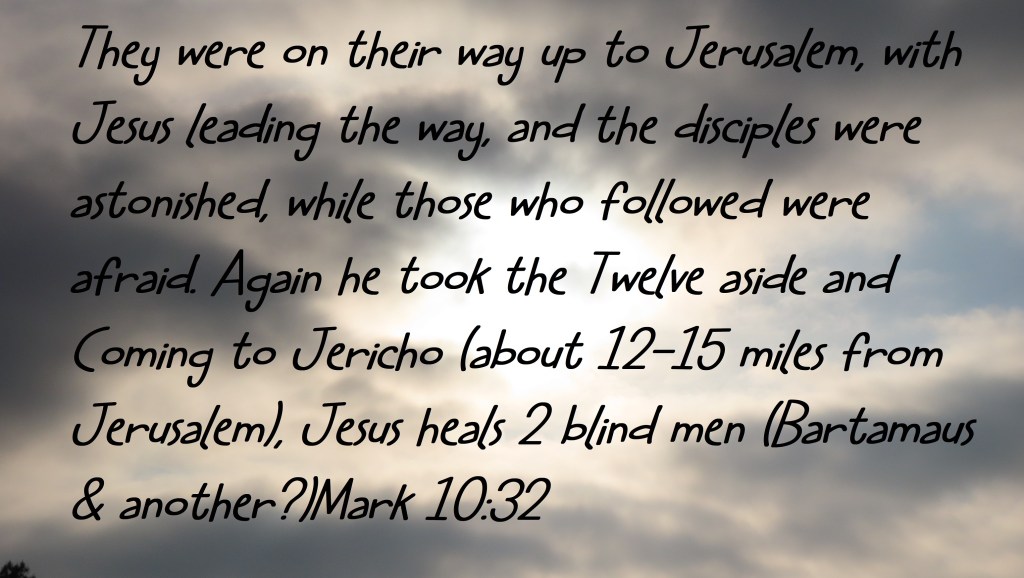 They were on their way up to Jerusalem, with Jesus leading the way, and the disciples were astonished, while those who followed were afraid. Again, he took the Twelve aside and coming to Jericho (about 12-15 miles from Jerusalem), Jesus heals 2 blind men (Bartamaus & another?)