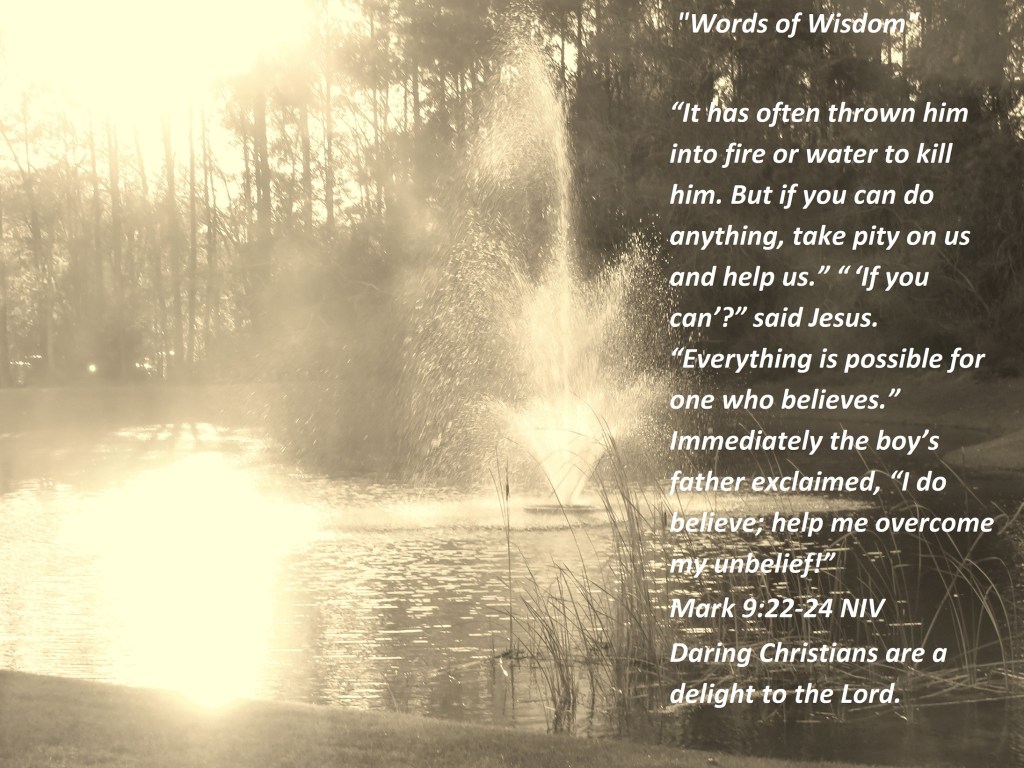 “It has often thrown him into fire or water to kill him. But if you can do anything, take pity on us and help us.” “ ‘If you can’?” said Jesus. “Everything is possible for one who believes.” Immediately the boy’s father exclaimed, “I do believe; help me overcome my unbelief!”