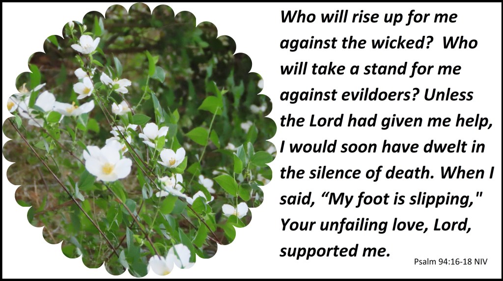 Who will rise up for me against the wicked? Who will take a stand for me against evildoers? Unless the Lord had given me help, I would soon have dwelt in the silence of death. When I said, “My foot is slipping,” Your unfailing love, Lord, supported me.