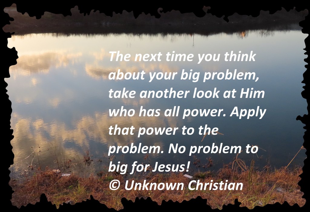 The next time you think about your big problem, take another look at Him who has all power. Apply that power to the problem. No problem too big for Jesus!