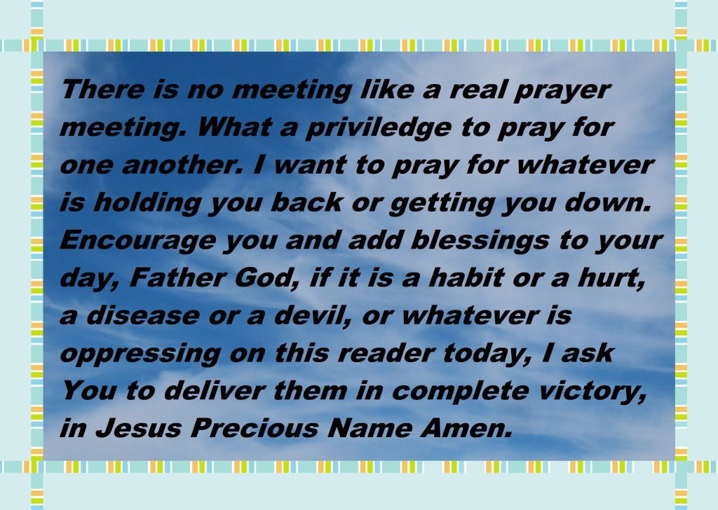 There is no meeting like a real prayer meeting. What a priviledge to pray for one another. I want to pray for whatever is holding you back or getting you down. Encourage you and add blessings to your day, Father God, if it is a habit or a hurt, a disease or a devil, or whatever is oppressing on this reader today, I ask You to deliver them in complete victory, in Jesus Precious Name Amen.