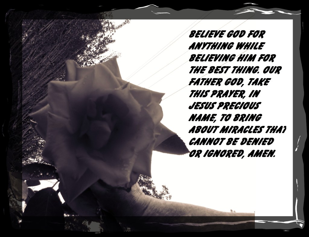 Believe God for anything while believing Him for the best thing. Our Father God, take this prayer, in Jesus Precious Name, to bring about miracles that cannot be denied or ignored, Amen.