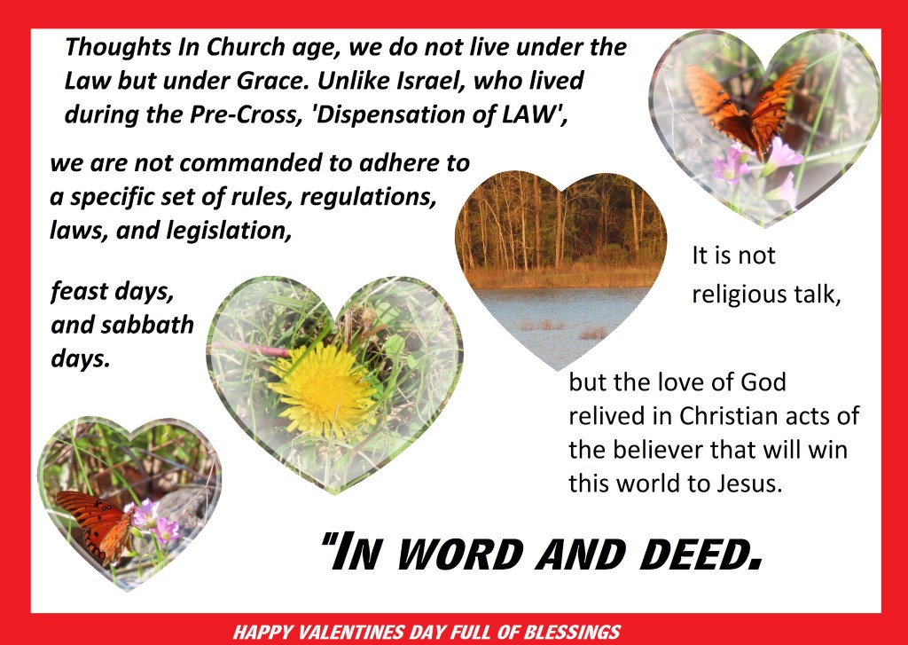 Thoughts In this Church age, we do not live under the Law but under Grace. Unlike Israel, who lived during the Pre-Cross, ‘Dispensation of LAW’, we are not commanded to adhere to a specific set of rules, regulations, laws, and legislation, feast days, and sabbath days. It is not religious talk, but the love of God relived in Christian acts of the believer that will win this world to Jesus. “In word and deed.