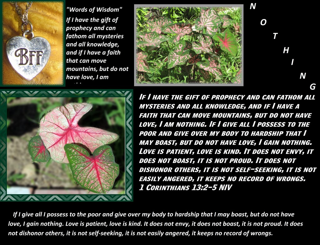If I have the gift of prophecy and can fathom all mysteries and all knowledge, and if I have a faith that can move mountains, but do not have love, I am nothing. If I give all I possess to the poor and give over my body to hardship that I may boast, but do not have love, I gain nothing. Love is patient, love is kind. It does not envy, it does not boast, it is not proud. It does not dishonor others, it is not self-seeking, it is not easily angered, it keeps no record of wrongs.