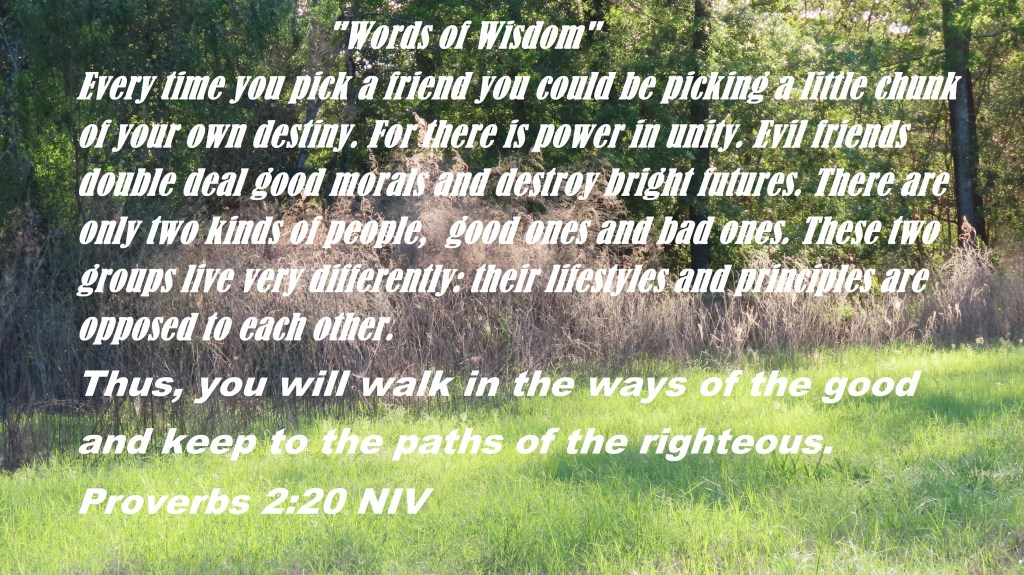 Every time you pick a friend you could be picking a little chunk of your own destiny. For there is power in unity. Evil friends double deal good morals and destroy bright futures. There are only two kinds of people, good ones and bad ones. These two groups live very differently: their lifestyles and principles are opposed to each other.
