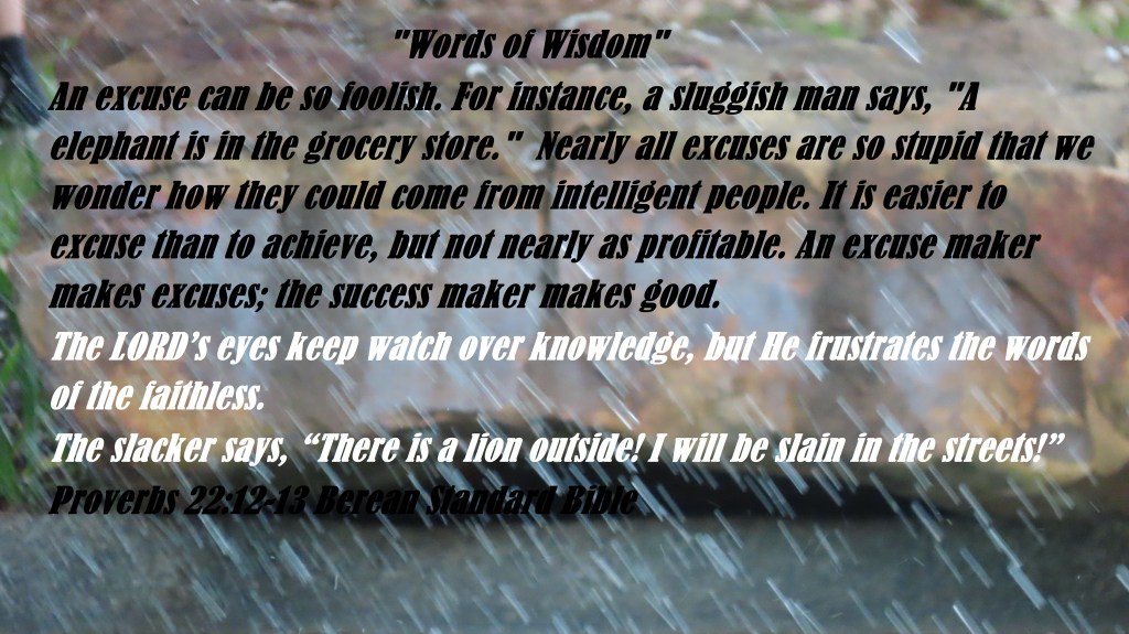 An excuse can be so foolish. For instance, a sluggish man says, “A elephant is in the grocery store.” Nearly all excuses are so stupid that we wonder how they could come from intelligent people. It is easier to excuse than to achieve, but not nearly as profitable. An excuse maker makes excuses; the success maker makes good.