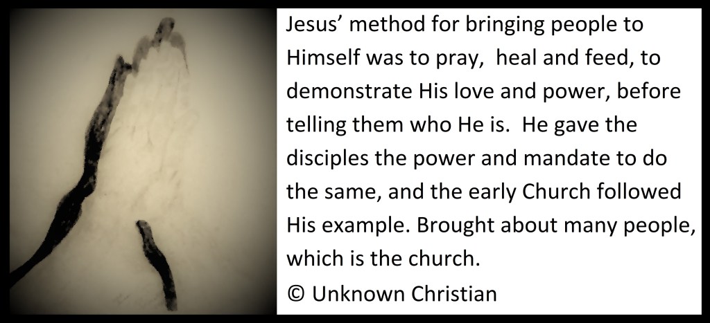 Jesus’ method for bringing people to Himself was to pray, heal and feed, to demonstrate His love and power, before telling them who He is. He gave the disciples the power and mandate to do the same, and the early Church followed His example. Brought about many people, which is the church.