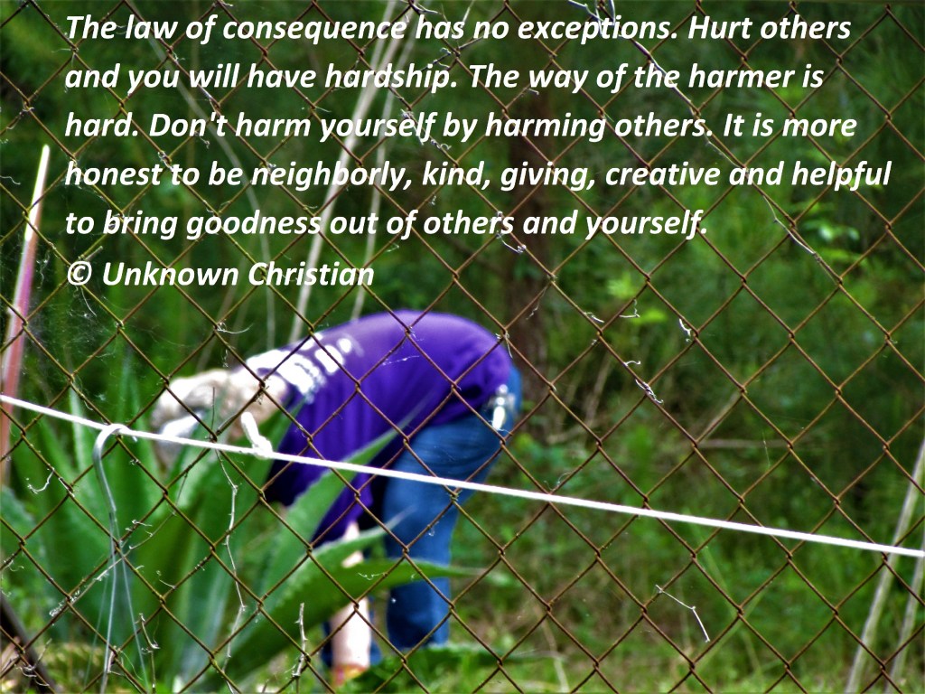 The law of consequence has no exceptions. Hurt others and you will have hardship. The way of the harmer is hard. Don’t harm yourself by harming others. It is more honest to be neighborly, kind, giving, creative and helpful to bring goodness out of others and yourself.