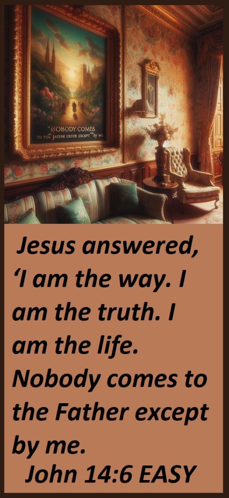 Jesus answered, ‘I am the way. I am the truth. I am the life. Nobody comes to the Father except by me.