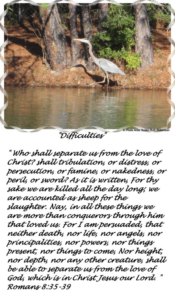 ” Who shall separate us from the love of Christ? shall tribulation, or distress, or persecution, or famine, or nakedness, or peril, or sword? As it is written, For thy sake we are killed all the day long; we are accounted as sheep for the slaughter. Nay, in all these things we are more than conquerors through him who loved us. For I am persuaded, that neither death, nor life, nor angels, nor principalities, nor powers, nor things present, nor things to come, Nor height, nor depth, nor any other creature, shall be able to separate us from the love of God, which is in Christ Jesus our Lord. “