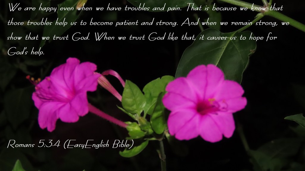 We are happy even when we have troubles and pain. That is because we know that those troubles help us to become patient and strong. And when we remain strong, we show that we trust God. When we trust God like that, it causes us to hope for God’s help.