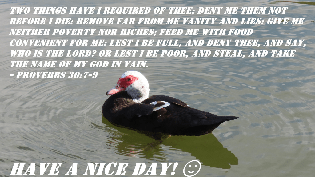 Two things have I required of thee; deny me them not before I die: Remove far from me vanity and lies: give me neither poverty nor riches; feed me with food convenient for me: Lest I be full, and deny thee, and say, Who is the LORD? or lest I be poor, and steal, and take the name of my God in vain.