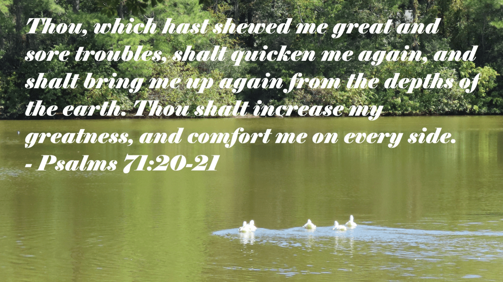 Thou, which hast shewed me great and sore troubles, shalt quicken me again, and shalt bring me up again from the depths of the earth. Thou shalt increase my greatness, and comfort me on every side.