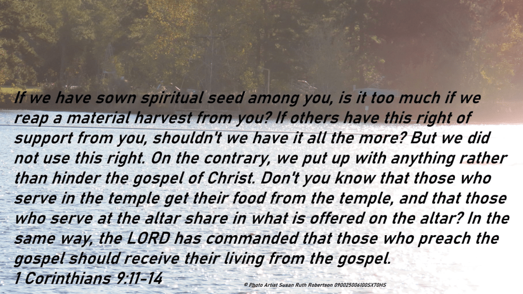 If we have sown spiritual seed among you, is it too much if we reap a material harvest from you? If others have this right of support from you, shouldn’t we have it all the more? But we did not use this right. On the contrary, we put up with anything rather than hinder the gospel of Christ. Don’t you know that those who serve in the temple get their food from the temple, and that those who serve at the altar share in what is offered on the altar? In the same way, the LORD has commanded that those who preach the gospel should receive their living from the gospel.