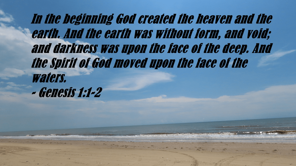 In the beginning God created the heaven and the earth. And the earth was without form, and void; and darkness was upon the face of the deep. And the Spirit of God moved upon the face of the waters.