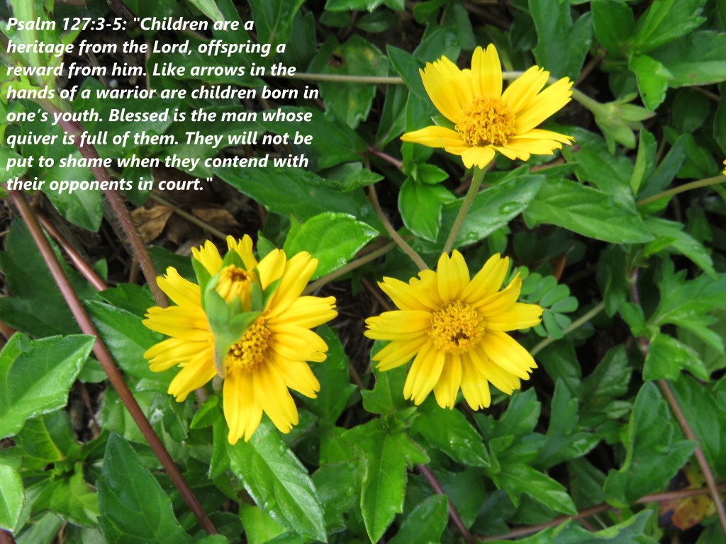 Psalm 127:3-5: “Children are a heritage from the Lord, offspring a reward from him. Like arrows in the hands of a warrior are children born in one’s youth. Blessed is the man whose quiver is full of them. They will not be put to shame when they contend with their opponents in court.”
