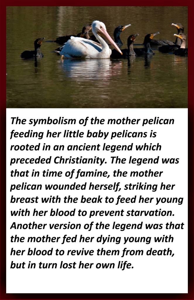 The symbolism of the mother pelican feeding her little baby pelicans is rooted in an ancient legend which preceded Christianity. The legend was that in time of famine, the mother pelican wounded herself, striking her breast with the beak to feed her young with her blood to prevent starvation. Another version of the legend was that the mother fed her dying young with her blood to revive them from death, but in turn lost her own life.