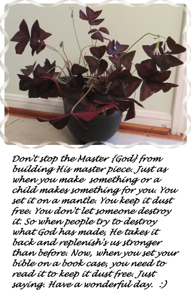 Don’t stop the Master {God} from building His master piece. Just as when you make something or a child makes something for you. You set it on a mantle. You keep it dust free. You don’t let someone destroy it. So when people try to destroy what God has made, He takes it back and replenish’s us stronger than before. Now, when you set your bible on a book case, you need to read it to keep it dust free. Just saying. Have a wonderful day.Β