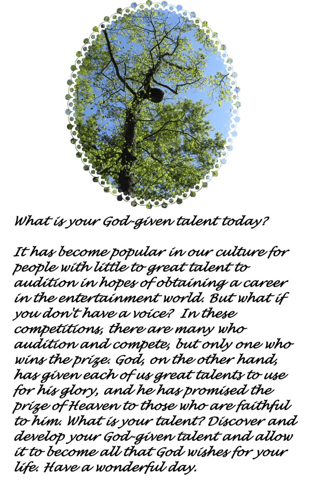 It has become popular in our culture for people with little to great talent to audition in hopes of obtaining a career in the entertainment world. But what if you don’t have a voice? In these competitions, there are many who audition and compete, but only one who wins the prize. God, on the other hand, has given each of us great talents to use for his glory, and he has promised the prize of Heaven to those who are faithful to him. What is your talent? Discover and develop your God-given talent and allow it to become all that God wishes for your life. Have a wonderful day.