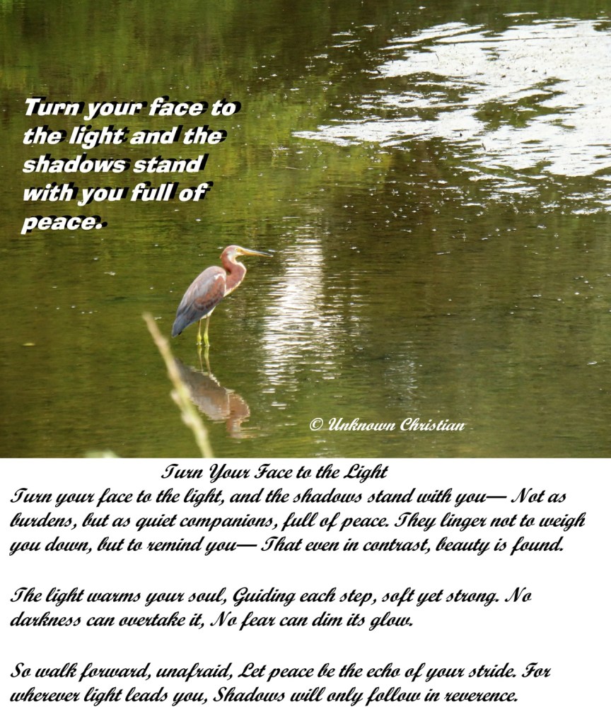 Turn your face to the light and the shadows stand with you full of peace. Light guiding the way and shadows standing as silent companions rather than fears. It reminds me of the idea that even in darkness, peace can be found when we walk toward hope.