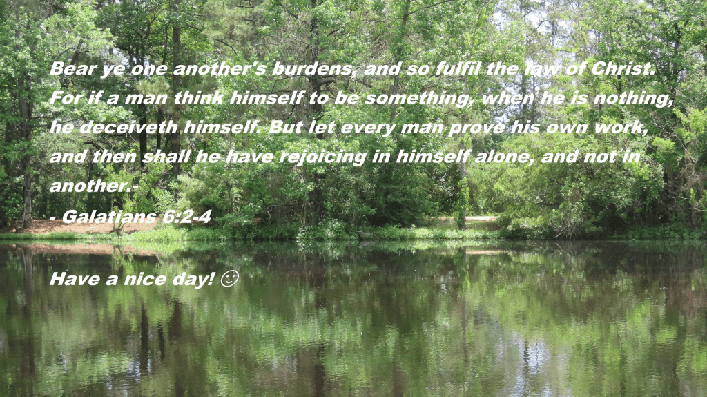 Bear ye one another’s burdens and so fulfil the law of Christ. For if a man think himself to be something, when he is nothing, he deceives himself. But let every man prove his own work, and then shall he have rejoicing in himself alone, and not in another.
