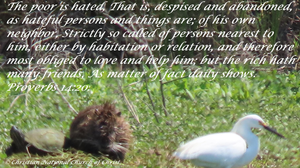 The poor is hated, that is, despised and abandoned, as hateful persons and things are; of his own neighbor, strictly so called of persons nearest to him, either by habitation or relation, and therefore most obliged to love and help him; but the rich hath many friends, As matter of fact daily shows. Proverbs 14:20.