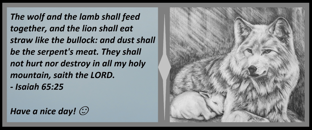 The wolf and the lamb shall feed together, and the lion shall eat straw like the bullock: and dust shall be the serpent’s meat. They shall not hurt nor destroy in all my holy mountain, saith the LORD.