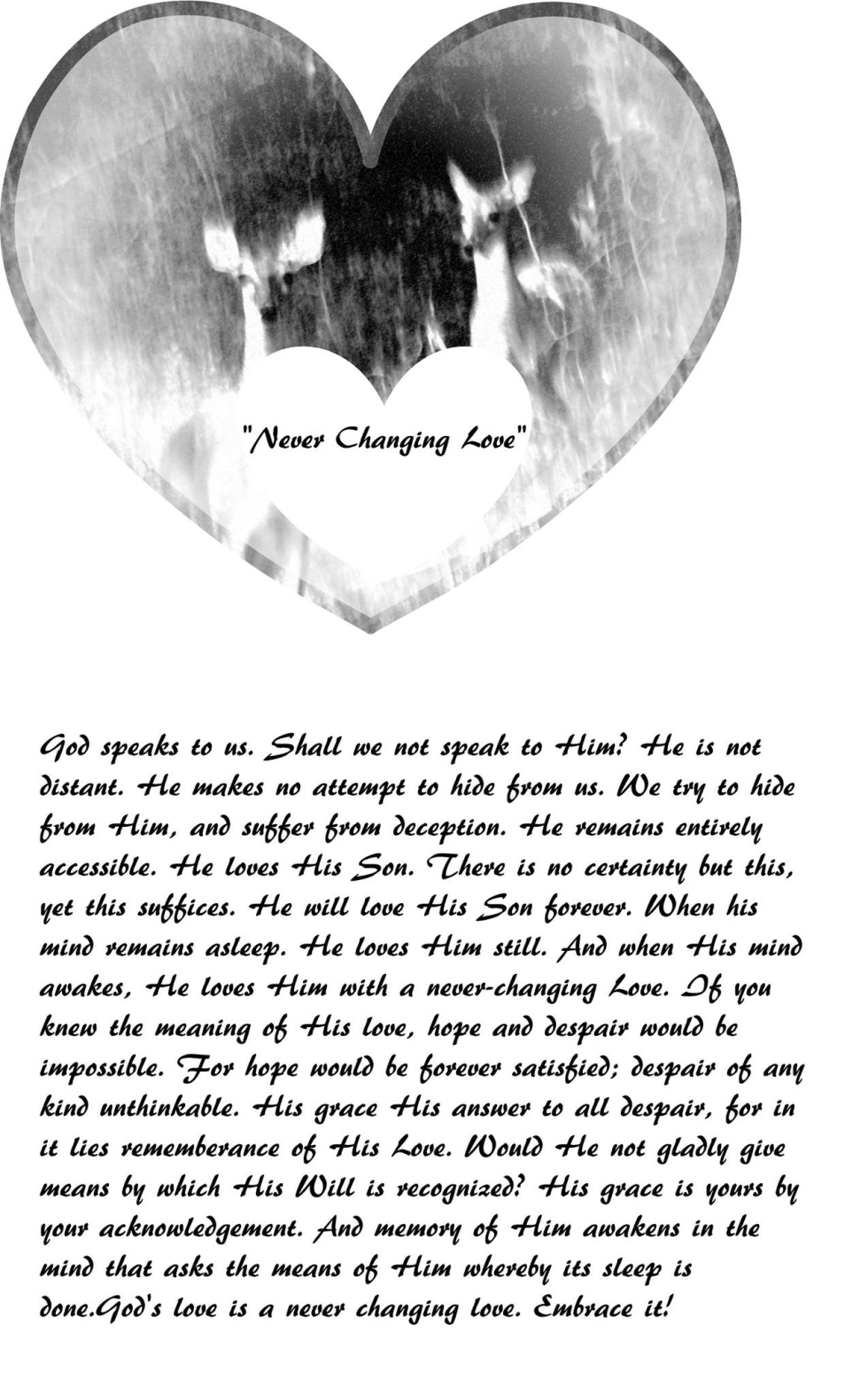 Father God, I was created in Your mind, a holy Thought that never left its home. I am forever Your Effect, and You forever and forever are my Cause. As You created me I have remained. Miracles are You. Righteousness is You. Your Love is Power. In Jesus Precious Name. Amen