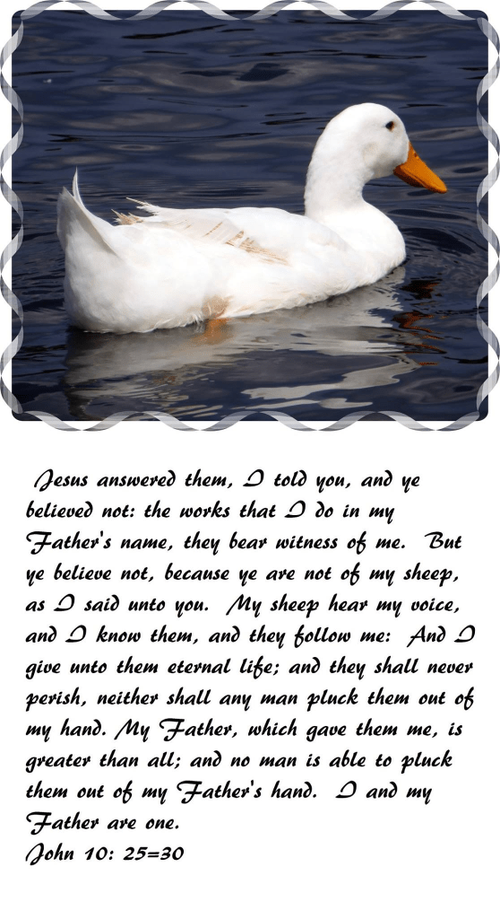 Jesus answered them, I told you, and ye believed not: the works that I do in my Father’s name, they bear witness of me. But ye believe not, because ye are not of my sheep, as I said unto you. My sheep hear my voice, and I know them, and they follow me:And I give unto them eternal life; and they shall never perish, neither shall any man pluck them out of my hand. My Father, which gave them me, is greater than all; and no man is able to pluck them out of my Father’s hand. I and my Father are one. “The heartbeat behind the words, it affirms that divine love is not only unchanging, but also fiercely protective and deeply personal.”