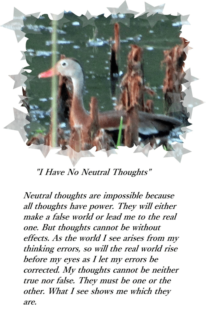 I Have No Neutral Thoughts”, is a powerful spiritual insight from A Course in Miracles, https://acim.org/acim/en/ specifically Lesson 16. It challenges the idea that our thoughts are harmless or idle, and instead affirms that every thought contributes either to illusion or to truth.