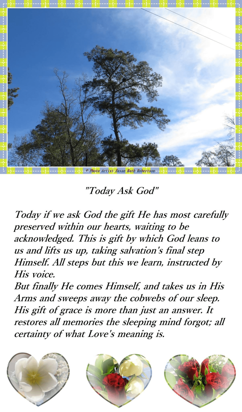 Father God, I was created in Your mind, a holy Thought that never left its home. I am forever Your Effect, and You forever and forever are my Cause. As You created me I have remained. Miracles are You. Righteousness is You. Your Love is Power. In Jesus Precious Name. Amen