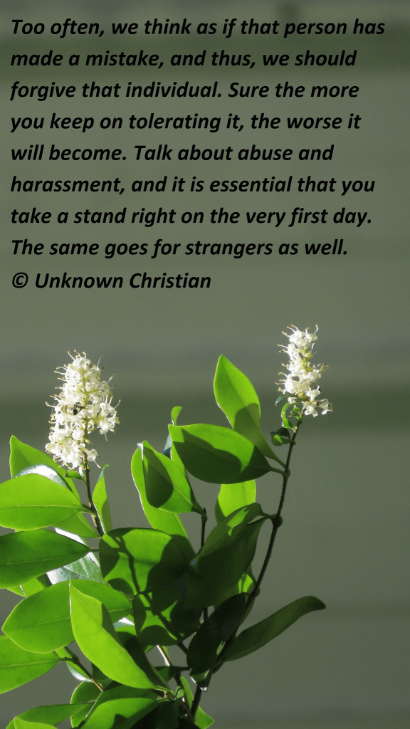 Too often, we think as if that person has made a mistake, and thus, we should forgive that individual. Sure the more you keep on tolerating it, the worse it will become. Talk about abuse and harassment, and it is essential that you take a stand right on the very first day. The same goes for strangers as well. © Unknown Christian
