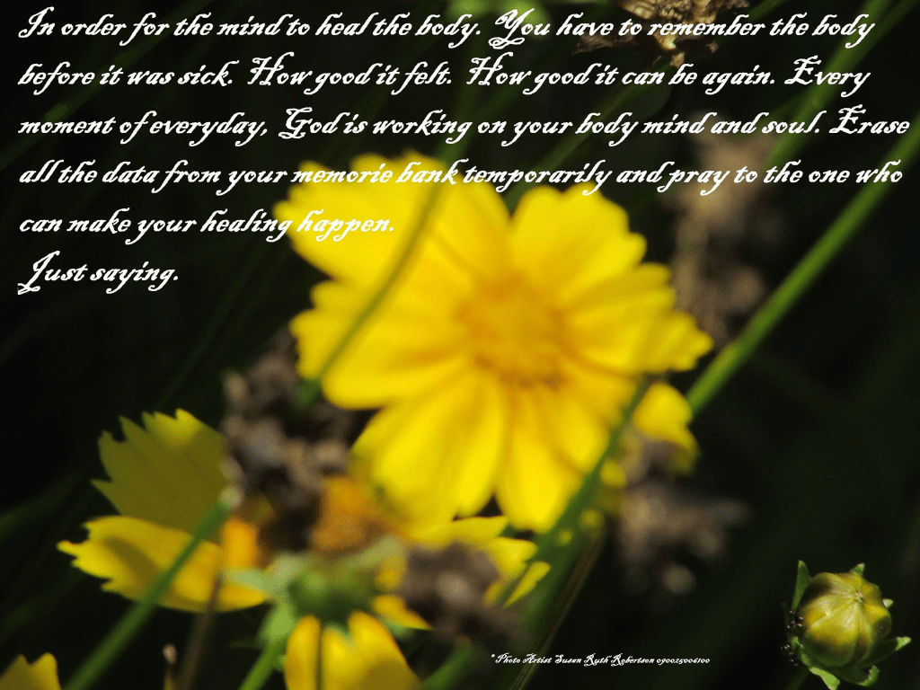 In order for the mind to heal the body. You have to remember the body before it was sick. How good it felt. How good it can be again. Every moment of everyday, God is working on your body mind and soul. Erase all the data from your memory bank temporarily and pray to the one who can make your healing happen. Just saying!