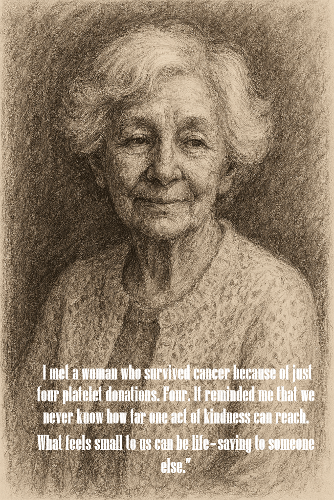 I met a lady January 27, 2026 at Costco, cured from cancer with just 4 platelet donations. That means a person going in twice to donate platelets. This is the kind of encounter that stops you in your tracks. Four platelet donations, two quiet, unseen acts of generosity, and they became part of someone’s healing story. I didn’t just meet a lady; I met living proof that small sacrifices can carry enormous miracles. Encouragement that when she thanked me even though we have different blood types made me feel good that she is alive because someone cared. I can imagine how that hit her heart, especially after she realized I was a donor. Now I see how much this sweatshirt carry’s. It’s like God gave me a glimpse of the ripple effect, the part we never really get to see.